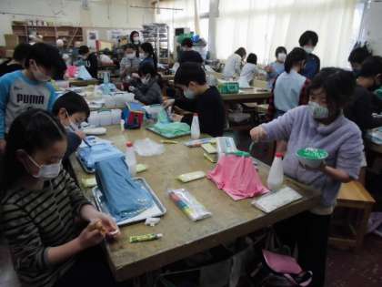 3年生は液体ねんどに浸した布や身の回りにある材料で、自分の「ワールド」を作っています。