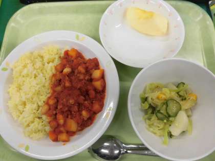 チリビーンズライスは、スパイシーな味わいで、お豆と刻んだ野菜がたくさん煮込まれたルーをかけて食べる料理です。