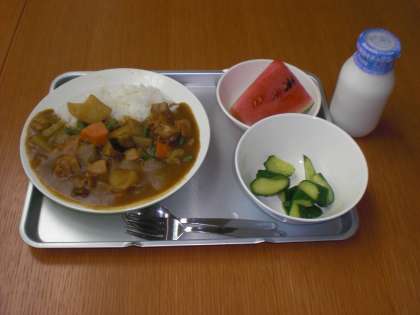 1学期の最後の給食になりました。夏野菜のカレーの中には、いつものカレーの食材と少し違って、鶏肉・トマト・なす・さやいんげんなどが入って幾分スープが多く感じられるものになっています。