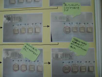 結果を見ると、石けんで洗って触った2枚の食パンには、カビが生えていません。