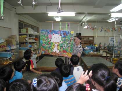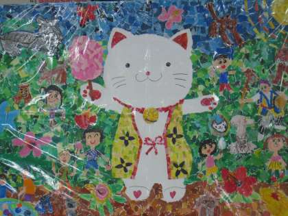 2年生は、6月末から図工の時間に「あきさみよ豪徳寺沖縄祭り」のイベントに関連したPRポスターの作製に取り組みました。題材は招福縁起猫「たまにゃん」を中心にシーサーを配置したものです。図工の時間や休み時間を利用して、みんなで作り上げました。