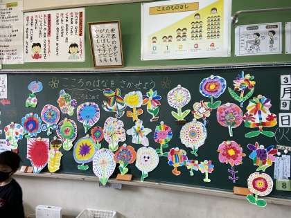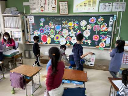 新1年生を迎えるための「こころの花」もつくっています。カラフルで個性的で素晴らしい作品ばかりです。