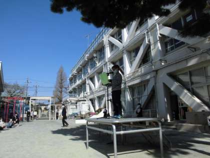 2年生は「できるようになったこと」を実演して発表しました。写真は竹馬じゃんけんをしているところです。