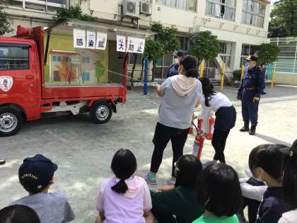 まちかど防災車消火訓練では、水の入った消化器を使って火の的に当てる練習をしました。