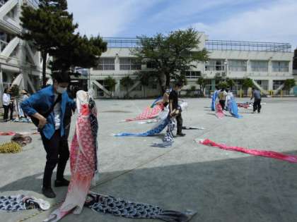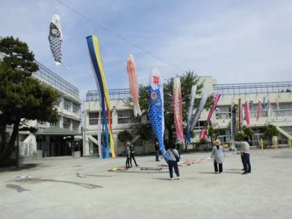 世田小地域ネットいぶきの皆様、保護者の皆様、先生たちで校庭にこいのぼりを設置しました。