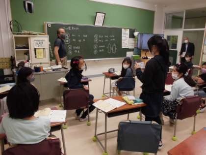 写真は、高さが増えると体積も増えることを、模型を使って発表しているところです。