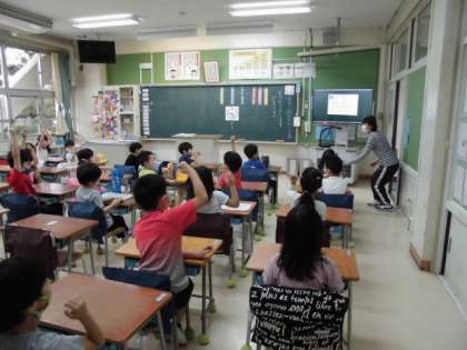写真は、担任の先生についてのクイズが当たって喜んでいる子どもたちです。