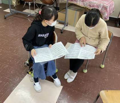 6年生に手伝ってもらったり同じパートの友達と教え合ったりして、楽譜を読みました。