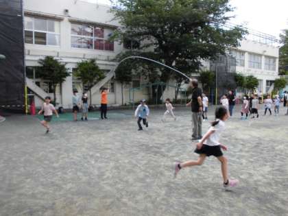 今朝は1・2年、仲よし学級の大なわ集会です。