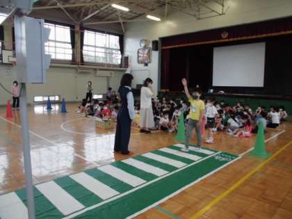 1年生は横断歩道の渡り方や、「とまれ」の表示のところでは一度止まって、右左を確認することなどを、実際に歩きながら勉強しました。