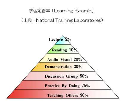 それぞれの学び方がピラミッド上に記載されていますが、一番定着率の良い学習方法は、自分の理解したことを、他の人に教えることなのですね。