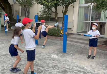 動きをタブレットで撮影し合い、自分の動きを確かめます。