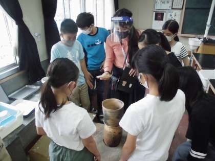 土器や石器などの実物を触って昔のくらしに触れる学習をしました。