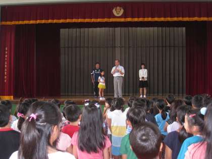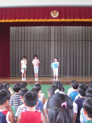 9月1日、体育館で始業式がもたれました。1年生と5年生の3名が全体を代表して2学期の目標を発表しました。また、転入生の1年生の紹介と、新しく赴任した仲良し学級の先生と給食室の主事さんの紹介がありました。