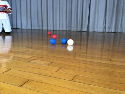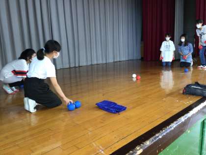 休み時間には体育館でパラスポーツ「ボッチャ」で遊んで盛り上がっていました。