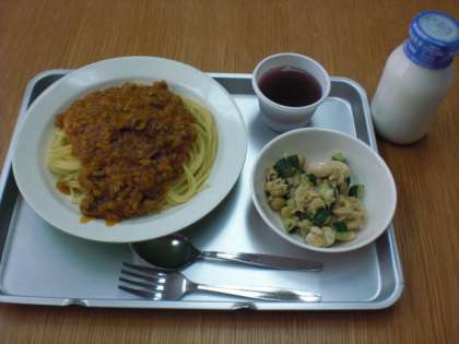 今日の給食は、スパゲティミートソース・ビーンズサラダ・ぶどうゼリー・牛乳です。
