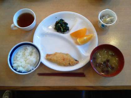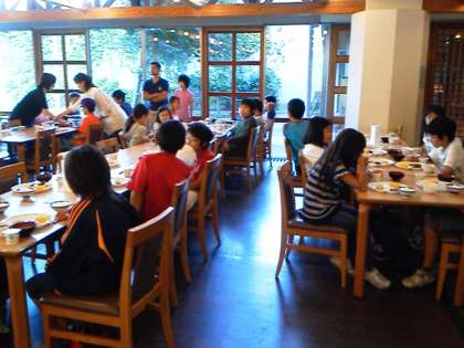 今日も好天。朝は肌寒いくらいですが、暑くなりそうです。まず、朝会と体操をして、次に朝食です。