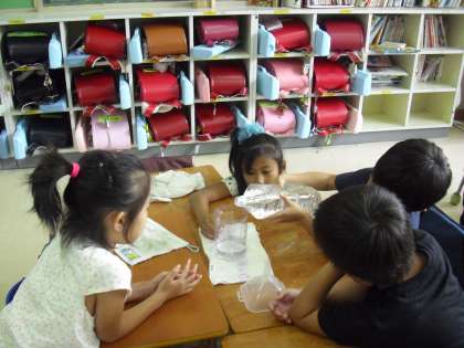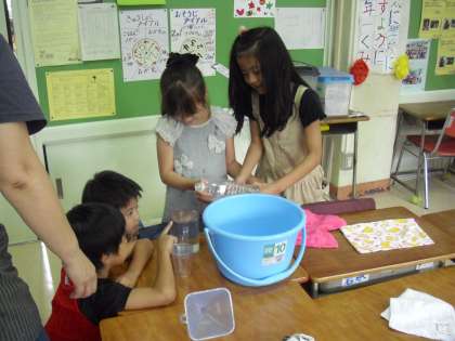 今週から算数では『水のかさ』に取り組んでいます。かさの単位Lの学習をした後、牛乳パックや大型ペットボトルには水はどのくらい入るのかを、全員で漏斗やバケツを使いながら実験しました。「水入れは次はぼくににやらせてよ」「順番、順番」の楽しそうな声が飛び交う中、「予想と違った!」との残念そうな声が聞こえてきたり、体験学習をおおいに楽しんだ2年生でした。