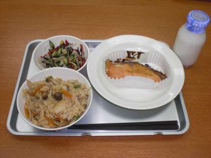 今日の給食は、しめじごはん・魚(鮭)のみそマヨネーズ焼き・大根とひじきのサラダ・牛乳です。