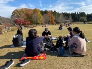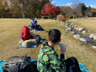 大谷川公園に着きました。予定より早いです。お弁当を食べて、みんな遊び始めました。楽しそうです。