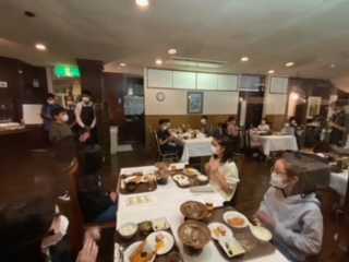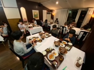 晩御飯です。すき焼き、エビフライ、湯葉など、「おいしい!」とみんな大喜びです。この時間は日光彫りをしている子どもたちもいます。