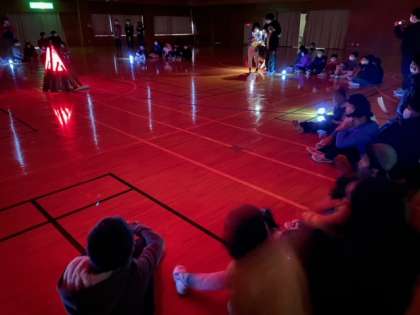 体育館でキャンプファイヤーです。火の神の入場で始まり、燃えろよ燃えろを歌い、各学校の紹介です。その後、昆虫太極拳、ナミナミナ、エビカニックスをみんなで踊り、大きな歌と誰かが星を見ていたをみんなで歌いフィナーレです。世界にひとつだけの花を最後に歌いながら退場しました。凝縮した感動的な時間でした。子どもたちがほんとうにすてきです。