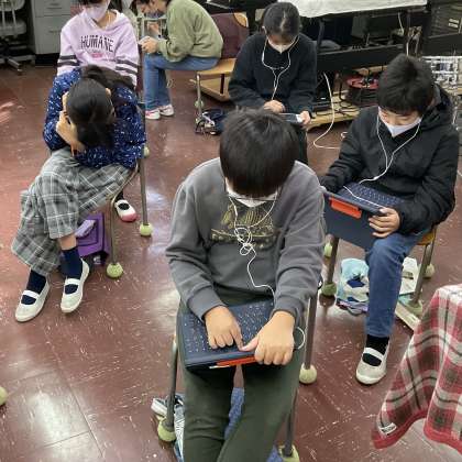 イヤホンを使って聴きながらも、つい旋律を口ずさんでしまう子がいたり(声に気づいて、教室が楽しい雰囲気になりました。)曲に集中して体を揺らして聴く子がいたり(たくさんいました!)、曲想が急に変化する部分で驚いた表情を浮かべる子がいたり(授業後、周りの子達に「びっくりしていたのはあの部分でしょ?」と聞かれ、会話が弾んでいました。)一人ひとり曲を聴き深めつつも、曲のよさを皆で共有できた時間になりました。