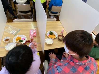 体育館で朝会を行いました。ラジオ体操で体をほぐします。今日はハイキングです。最高のお天気です。さあ、朝ご飯です。しっかり食べて1日を始めましょ
