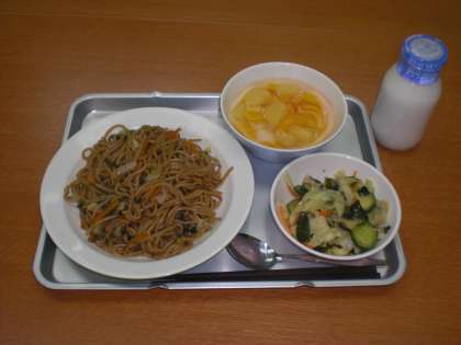 今日の給食は、ソース焼きそば・わかめサラダ・フルーツ白玉・牛乳です。