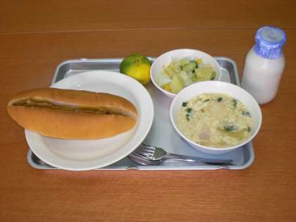今日の給食は、ドライカレーサンド・チーズのふわふわスープ・コーン入りフレンチサラダ・牛乳です。