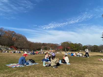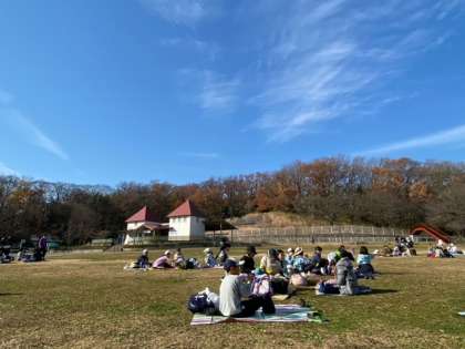 アスレチックでたくさん遊んでお弁当です。風もなく穏やかな小春日和です。みんな楽しそうにおいしそうに食べてます。