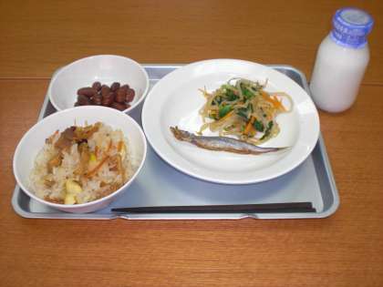 今日の給食は、秋の香りごはん・焼きししゃも・おひたし・煮豆・牛乳です。