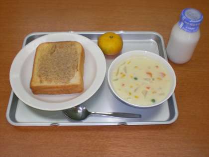 今日の給食は、セサミトースト・コーンシチュー・みかん・牛乳です。