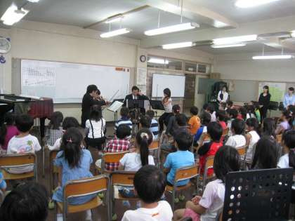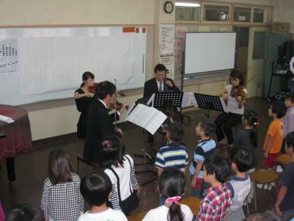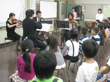 10月17日(月)3・4時間目に、弦楽器の演奏家4人の方に来て頂き、クラシックの演奏から、子どもたちのよく知っている映画音楽まで素敵な演奏を聞くことができました。音楽の授業で勉強している歌や校歌を、演奏に合わせて歌う事にも挑戦でき、大きな歌声が音楽室に響きました。目の前で生の演奏を聞くことができ、わくわく、ドキドキの2時間でした。