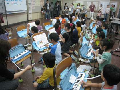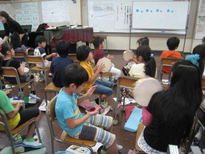 2年生の音楽の授業は、2拍子の拍子をとる学習に取り組んでいます。最初は手拍子ですが、次はカスタネットとタンバリンを使って取り組みました。ペアの二人で交代しながら練習しました。その後、鍵盤ハーモニカで演奏をしました。