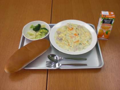 今日の給食は、ショートニングパン・マカロニのホワイトソース・ブロッコリーサラダとセレクトした飲み物です。(コーヒー牛乳・オレンジジュース・りんごジュース・牛乳)