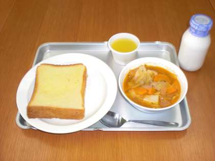 今日の給食は、フレンチトースト・ボルシチ・みかんゼリー・牛乳です。
