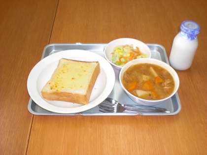今日の給食は、ガーリックトースト・ビーンズシチュー・コーンサラダ・牛乳です。