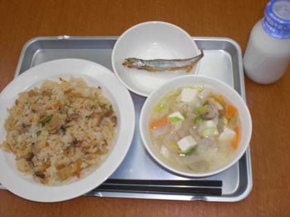 今日の給食は、きのこごはん・豚汁・焼きししゃも・牛乳です。
