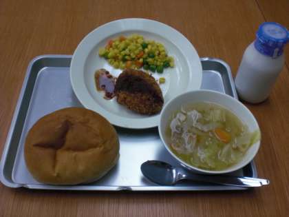 今日の給食は、丸パン・コロッケ・ベジタブルソテー・野菜スープ・牛乳です。