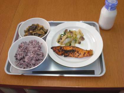 今日の給食は、黒米ごはん・鮭の南部焼き・きのこ入り煮びたし・きざみこんぶの五目煮・牛乳です。