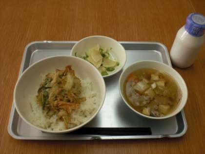 今日の給食は、かきあげ丼・豆腐汁・かぶのレモンじょうゆかけ・牛乳です。