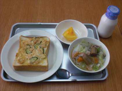 今日の給食は、ツナトースト・ポトフ・柿・牛乳です。