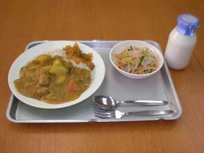 今日の給食は、チキンカレーライス・福神漬・こんにゃくサラダ・牛乳です。