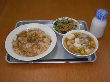 今日の給食は、子ぎつねごはん・さつま汁・おひたし・牛乳です。
