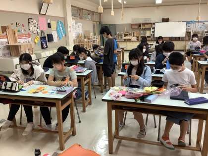 おうちから不要な布(着られなくなった衣服など)、フェルト、綿、ボタン、チャック、巾着用のひもなどの材料を持ってきて、オリジナルの作品を作り上げます。