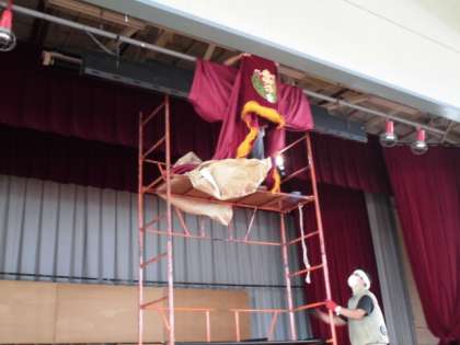 記念式典が近づき、新しい緞帳の付け替え作業がありました。
