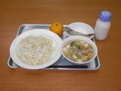 今日の給食は、雑穀ごはん・ししゃものからあげ・けんちん汁・みかん・牛乳です。