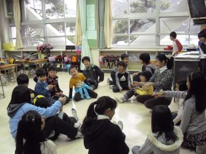 毎月たてわり班の活動がありますが、1月はあいにく雪のたてわり班あそびになってしまいました。6年生の班長さんは、必ず天気のよい場合の遊びと雨(雪)の場合の遊びを考えて決めています。体育館で遊べる班を除いて、今回は室内遊びをすることになりました。ハンカチ落としやばくだんゲームをしました。