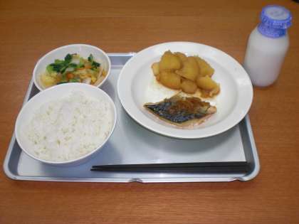 今日の給食は、ごはん・魚の南蛮焼き・野菜のおかかかけ・じゃがいもの甘辛煮・牛乳です。